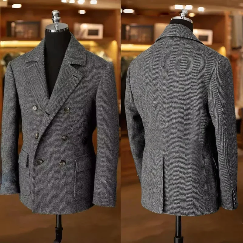 British Men’s Blazers Vintage Herringbone Tweed Formal Jacket Wool Blend Double Breasted Casual Autumn Winter Suit Coat